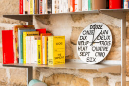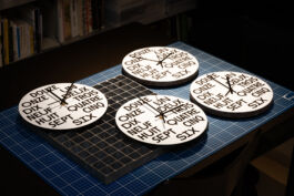 Horloge réalisée pour objet trouvé. Un modèle en lave émaillée et un en tôle émaillée, avec une sérigraphie noire. Système à quartz, pile LR6 (AA).